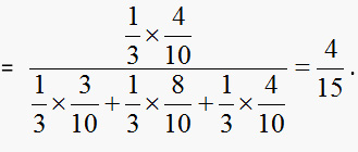 Example 15: Three bags contain 3 red, 7 black; 8 red, 2 black, and 4 red & 6 black balls respectively. 1 of the bags is selected at random and a ball is drawn from it. If the ball drawn is red, find the probability that it is drawn from the third bag.