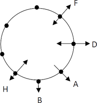 • A and F are immediate neighbours of D. H sits second to the right of A. This would give rise to 4 possibilities. First, F can be between B & D and A will be on the other side of D. Secondly, A can be between B and D while F will be on the other side of D. Each case is explained below with possible directions of 'A' (inside/ outside).A is sitting at other side of D (not between B and D) and F is between B and D. Now A can face inside or outside. Now in case we take A as facing outside, then 2nd to the right would be H where as we know that this position belongs to F since it is A and F who are neighbours of D, so in this situation we can take A to be facing only inside. We can also add H as 2nd anti clockwise to A and place F between B and D. Directions, of F, D and H, are not clear yet, so they could be facing inside or outside.